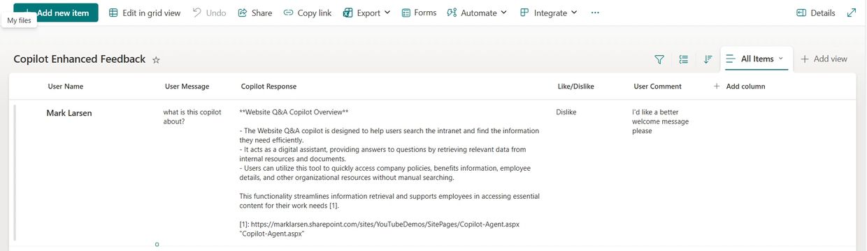 We don’t just capture Copilot feedback—we transform it into a powerful decision-making engine. Our solution takes Copilot’s “like/dislike” ratings and comments, stores them in a customized SharePoint list, and elevates the experience with a Power App interface featuring clickable AI-driven action items for proposed resolutions.